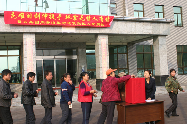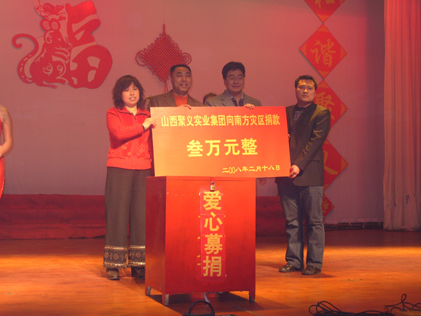 聚義集團(tuán)歷年來多次為湖南雪災(zāi)、四川震災(zāi)、云南旱災(zāi)、青海玉樹震災(zāi)捐款捐資,救助累計(jì)百余次達(dá)620多萬元。