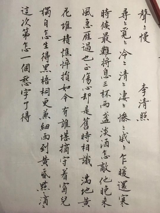 尋尋覓覓,冷冷清清,凄凄慘慘戚戚。乍暖還寒時(shí)候,最難將息。三杯兩盞淡酒,怎敵他、晚來(lái)風(fēng)急?雁過(guò)也,正傷心,卻是舊時(shí)相識(shí)。